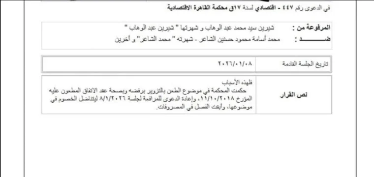 وحددت المحكمة جلسة الثامن من يناير (كانون الثاني) 2026 لمتابعة نظر الدعوى بين الطرفين بعد تأكيد سلامة المستندات.