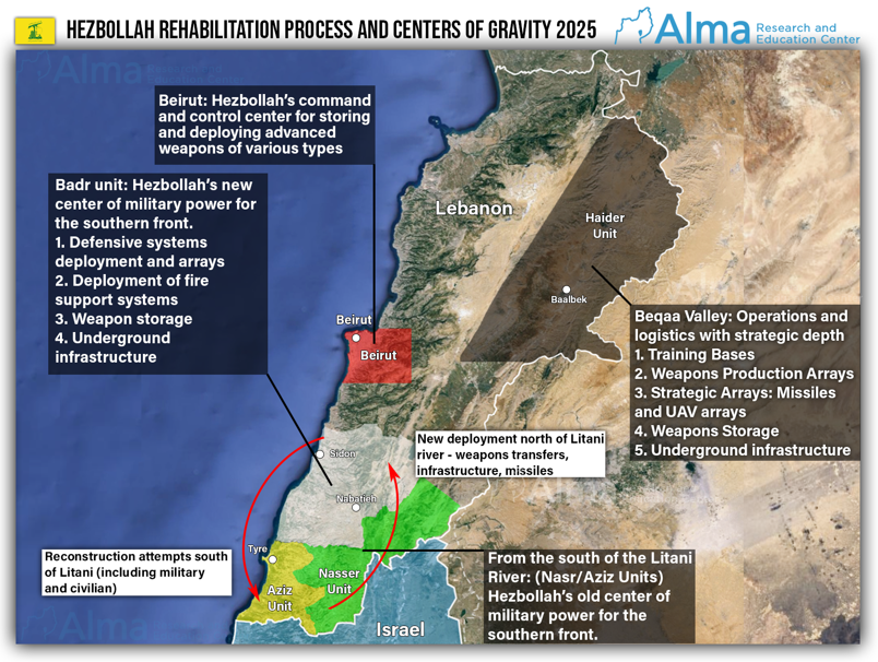 ويقول التقرير الذي أعده، تال باري، رئيس قسم الأبحاث في مركز “ألما” للدراسات الأمنية، إن “إيران لم تتوقف منذ الحرب الأخيرة في لبنان عن إعادة بناء الحزب في لبنان، وتدير أنشطتها عبر غطاء متشعب من البنى التحتية المدنية المفترضة”.
